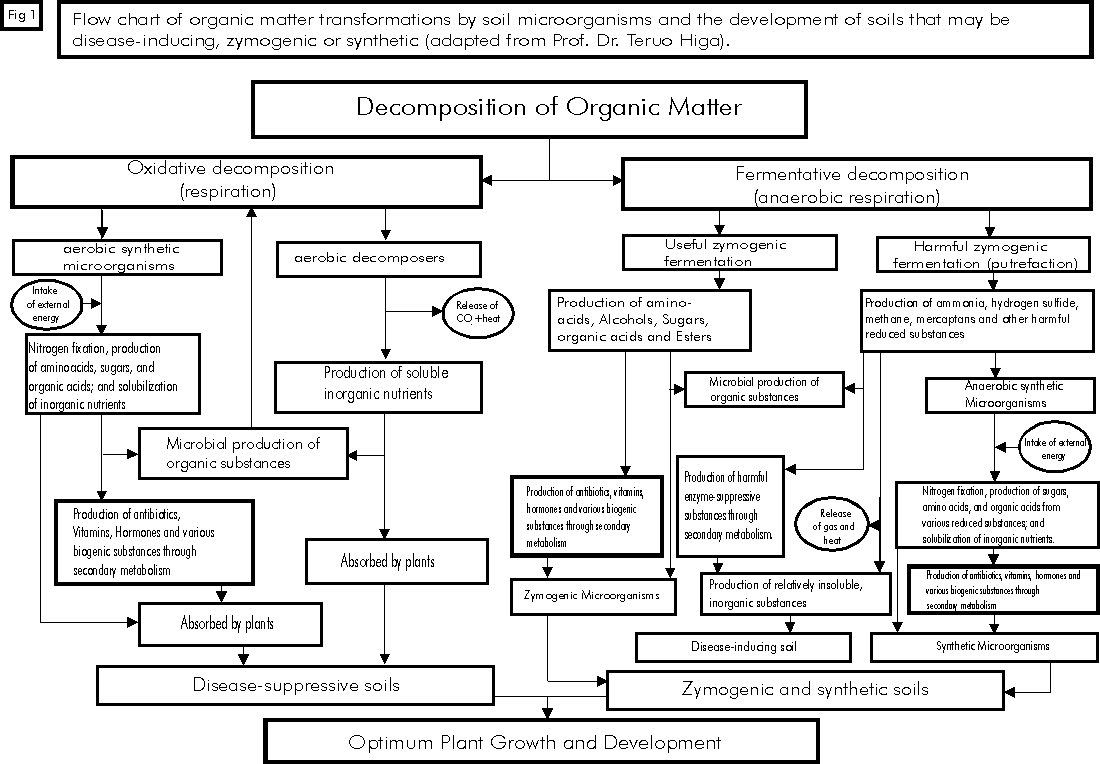 Soil microorganisms can be classified into decomposer and synthetic microorganisms. The decomposer microorganisms are subdivided into groups that perform oxidative and fermentative decomposition. The fermentative group is further divided into useful fermentation (simply called fermentation) and harmful fermentation (called putrefaction). The synthetic microorganisms can be sub-divided into groups having the physiological abilities to fix atmospheric nitrogen into amino acids and/or carbon dioxide into simple organic molecules through photosynthesis. Figure 1 (adapted from Higa) is a simplified flow chart of organic matter transformations by soil microorganisms that can lead to the development of disease-inducing, disease-suppressive, zymogenic, or synthetic soils.