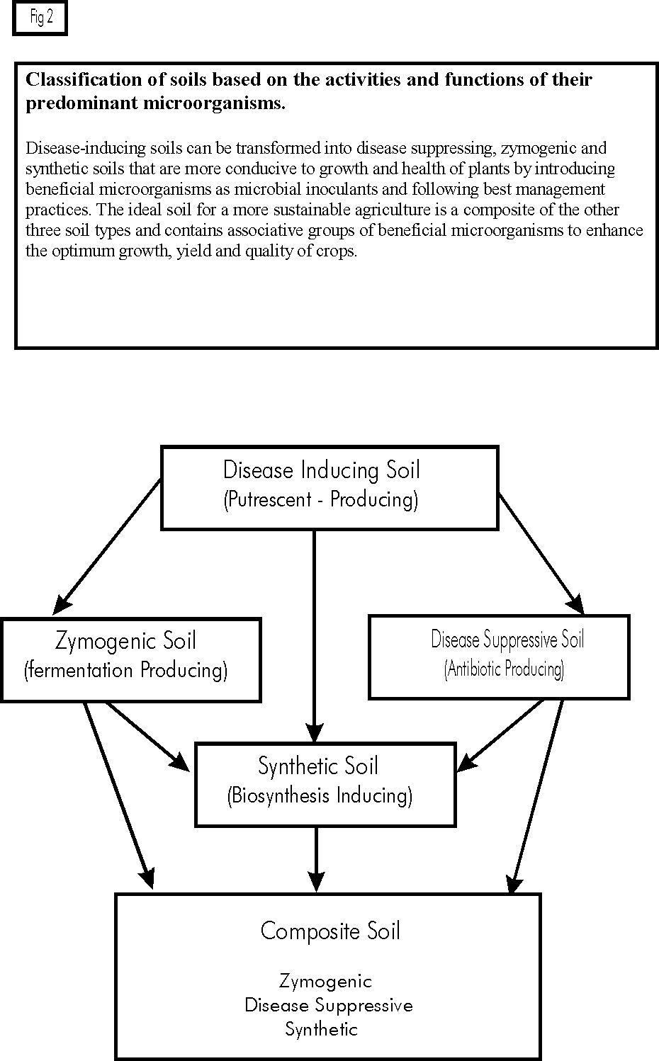 This is a somewhat simplistic classification of soils based on the functions of their predominant types of microorganisms, and whether they are potentially beneficial or harmful to the growth and yield of crops. While these different types of soils are described here in a rather idealized manner, the fact is that in nature they are not always clearly defined because they often tend to have some of the same characteristics. Nevertheless, research has shown that a disease-inducing soil can be transformed into disease-suppressing, zymogenic and synthetic soils by inoculating the problem soil with mixed cultures of effective microorganisms (Higa, 1991; 1994; Parr et al., 1994). Thus it is somewhat obvious that the most desirable agricultural soil for optimum growth, production, protection, and quality of crops would be the composite soil indicated in Fig. 2, i.e., a soil that is highly zymogenic and synthetic, and has an established disease-suppressive capacity. This then is the principle reason for seeking ways and means of controlling the microflora of agricultural soils.